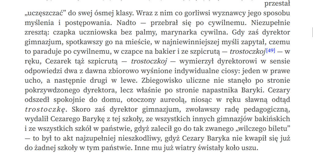 – Co to za wiersze? – spytałem i złapałem znowu kołnierz ohydnej, przepoconej koszuli.– Satyryczne. Na różnych opozycjonistów, kontestatorów, w ogóle wrogów.– A dowcipy?– Dowcipy to na ludzi z rządu. Dwa rodzaje anegdot. Jedne sondażowe, żeby sprawdzić, jak tłum reaguje, a drugie przeciwko działaczom, którzy wylatują z obiegu.– Potworze. Zawołam jednak ludzi, żeby cię zlinczowali.