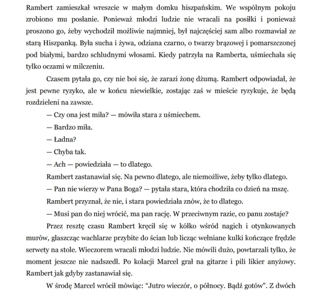 Rambert, 2 rozmowy z Rieux i Tarrou (s. 48) oraz rozmowa z Hiszpanką.