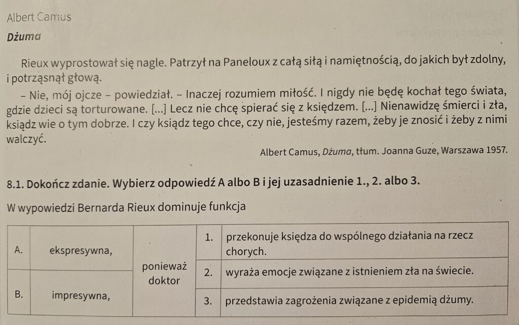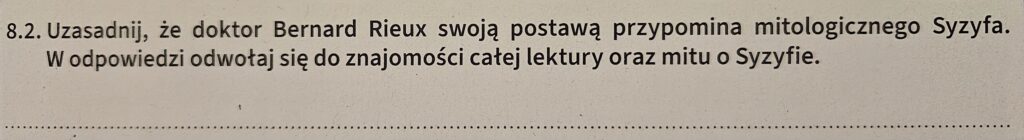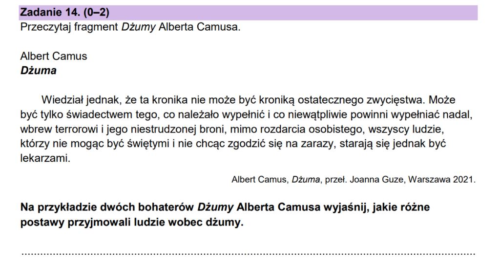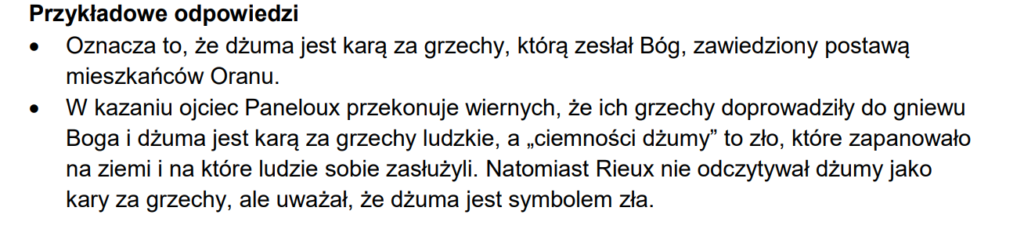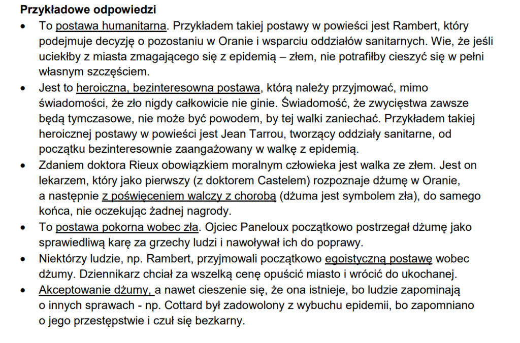 Przykładowe rozwiązanie: „Dżumę możemy uznać za parabolę, gdyż fakty i wydarzenia z treści możemy rozumieć dosłownie lub w sposób przenośny, o czym informuje nas już samo motto, które sugeruje pokazywanie jednych rzeczy przez inne, np. uwięzienie. Kwarantanna, każąca tkwić bohaterom w Oranie, może więc oznaczać utknięcie w złej, absurdalnej sytuacji (w czasie stanu wojennego w Polsce było to odbierane jako bardzo aktualne: kwarantanna Oranu to zamknięcie granic przez „zadżumionych” komunistów).