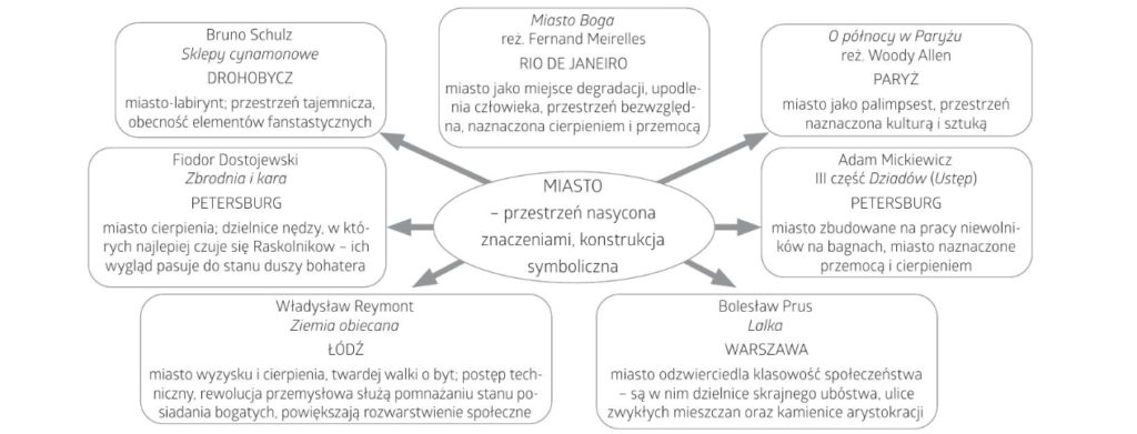 Biblia: Sodoma, Gomora, Jerycho, Babilon, Jeruzalem; wiersze Tuwima („Wiosna”, „Mieszkańcy”), Peiper i pochwała nowoczesności miast (3xM), Kafka w „Procesie” – miasto groteskowe, absurdalne, przestrzeń oniryczna, która osacza.