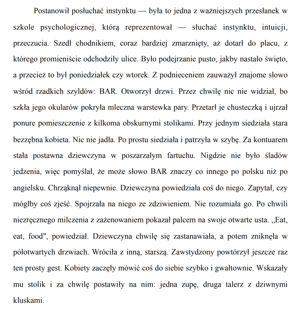 – Ja was wszystkich pogonię. Rozbisurmaniliście się, rozwydrzyli, tylko żłopać darmową wódę i wykradać salceson. Tańczyć mi tu zaraz! Bierz Niemca pod pachy i halsuj, bo makówę rozwalę – i [kuchmistrz] wyciągnął nagle zza koszuli wielki, wyłysiały nagan, jakąś pewnie drogą pamiątkę z dawnych czasów. Pchnął brutalnie Edwarda i ten posłusznie objął wpół doktora Gonsiorka. Zaczęli podrygiwać w miejscu, bo melodia tanga była jednak chwytliwa.