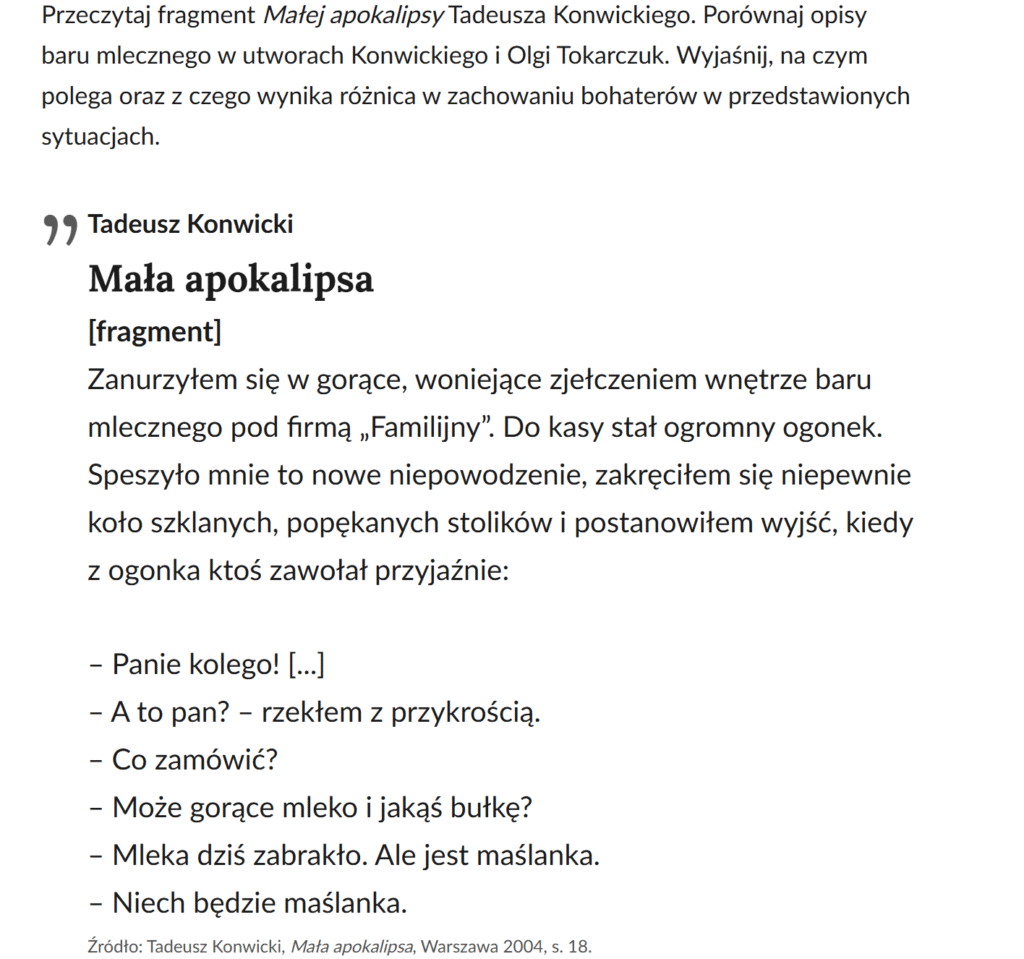 Zadanie: Do jakiego innego tekstu nawiązuje poniższy fragment? Wskaż jedno podobieństwo i jedną różnicę między zacytowaną sceną a wymienionym utworem.